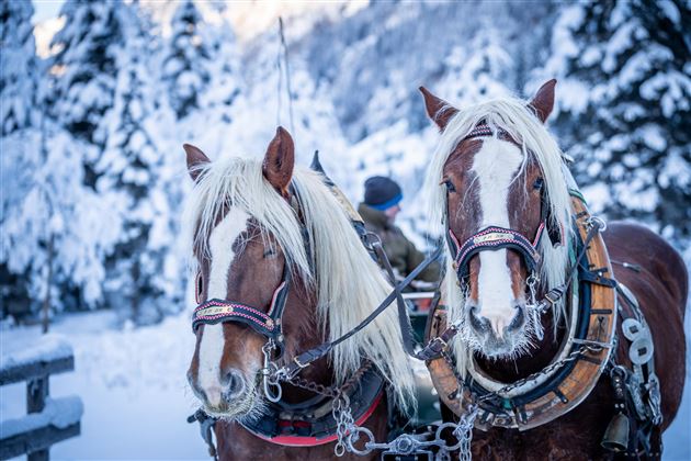 Auf über 1.200m Seehöhe genießen Sie die wunderbare Berglandschaft. Abseits von Verkehr und Stress können Sie hier entspannen. Erleben Sie bei Glockengeläut mit dampfenden Pferden eine romantische Pferdeschlittenfahrt abseits der Straße, auf extra angelegten Schlittenspuren mit einem Zwischenstopp im Alpstüble Moos.